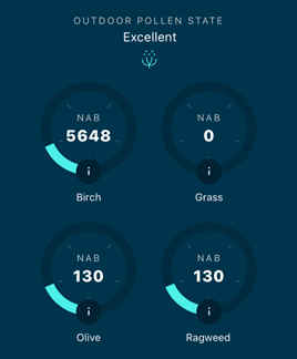 Informacije o kvalitetu zraka na otvorenom nalaze se na vrhu početne stranice aplikacije. One opisuju kvalitet zraka i nivo prisutnog polena u gradu gdje se nalazite.