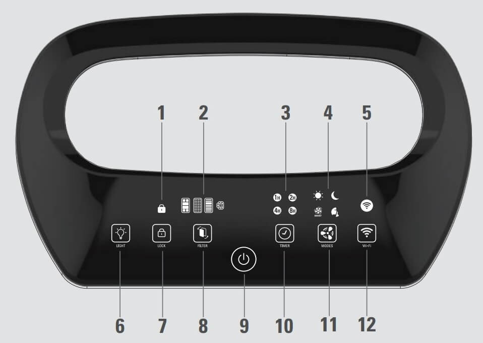Indikator zamjene filtera (2) će se uključiti kad bude potrebno zamijeniti ili očistiti filter (predfilter) filter te ćete dobiti obavještenje na mobilnoj aplikaciji.