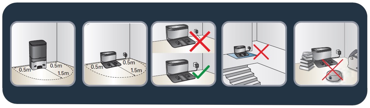To mjesto mora biti oslobođeno svih prepreka (uključujući tepihe). Ostavite najmanje 1,5m praznog prostora sa lijeve i sa desne strane i 2m ispred baze. Ukoliko ste bazu stavili u ugao ili ju je teško pronaći, robot usisivač neće moći doći do nje.